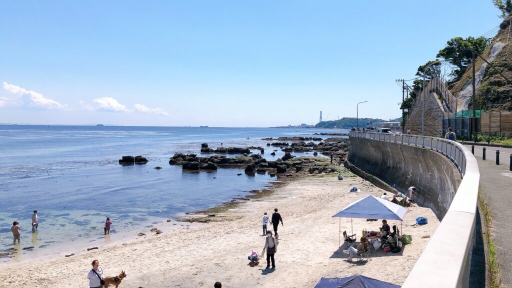 東京湾とは思えない美しいビーチで密かな人気がある穴場スポット。干潮時は水深0.1 ~ 0.5m の広い磯が出現する。すぐ隣にある観音崎自然博物館では東京湾や三浦半島の自然を感じられる展示がされている。