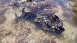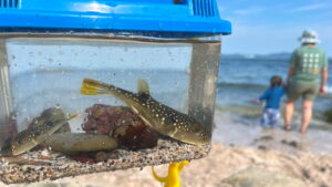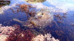 外洋につながる入り江の入口付近ではスズメダイ等の小魚に加えてアイゴやニザダイがよく見られる。メジナの群れや縦縞の入ったイシダイの幼魚がみられることも。釣り人も多いのでトラブルにならないよう注意しよう。