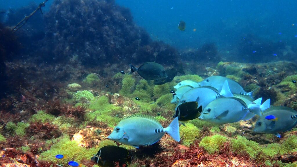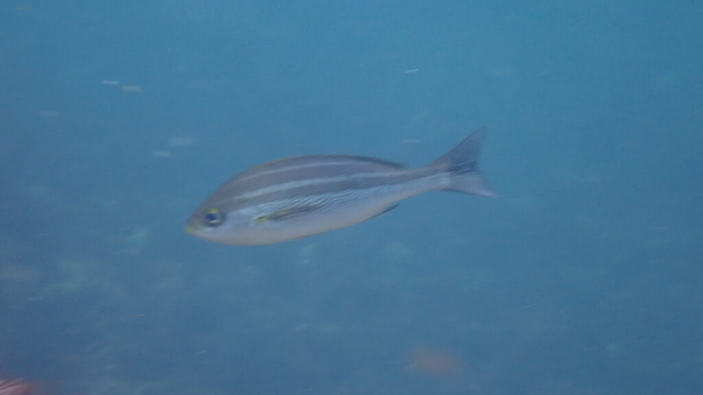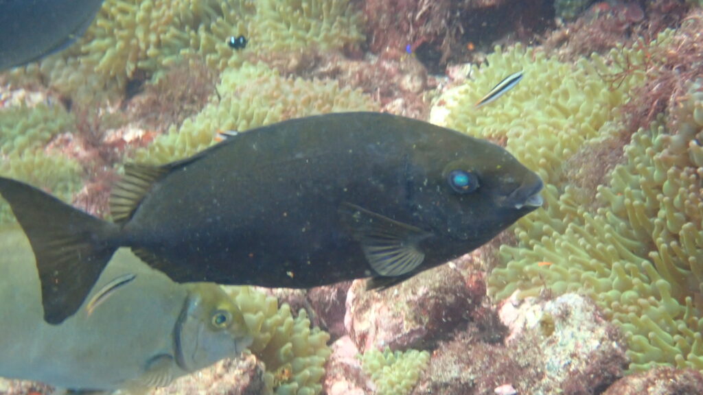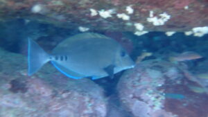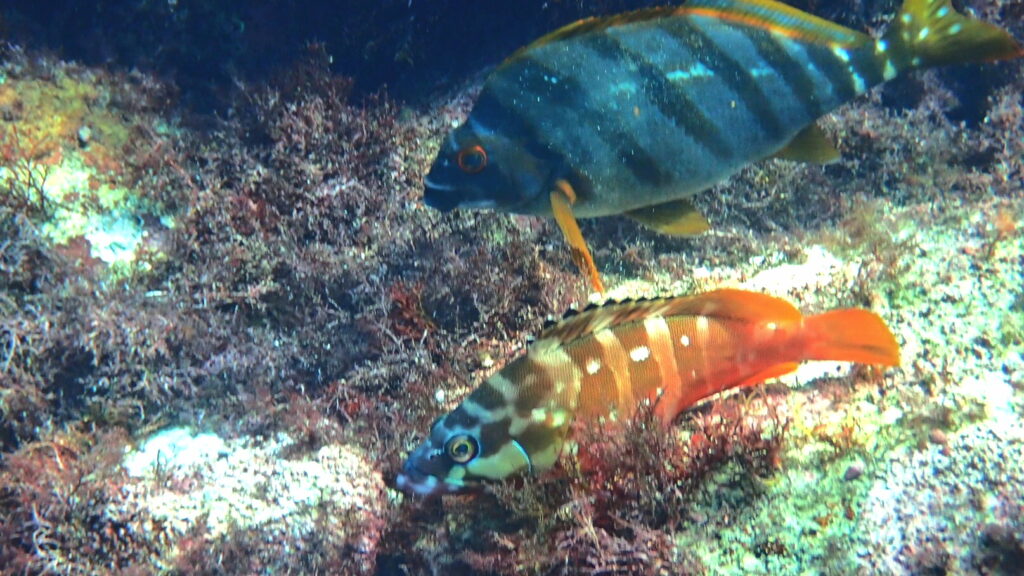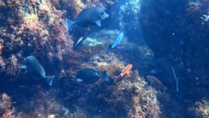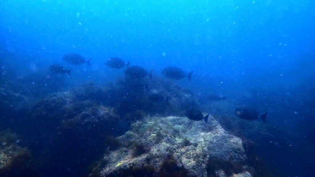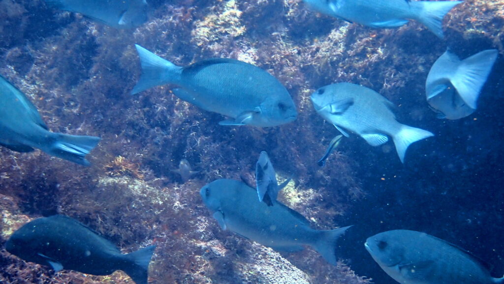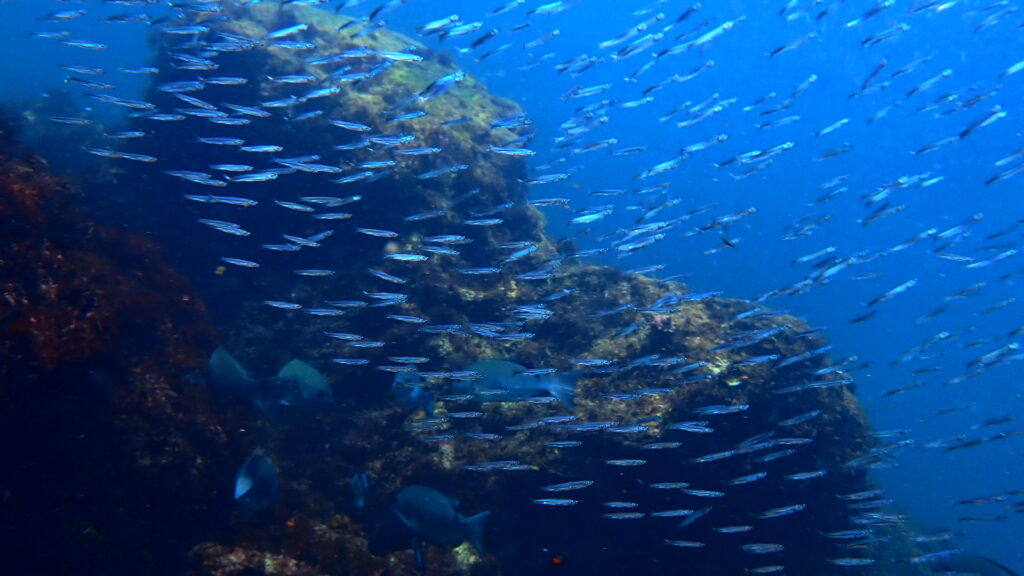 魚が非常に多く、ネンブツダイやクロホシイシモチ、ソラスズメダイのような小魚からメジナ、ニザダイ、ブダイなどの中型の魚、カンパチやイシダイなど釣りのターゲットまで見ることができる。