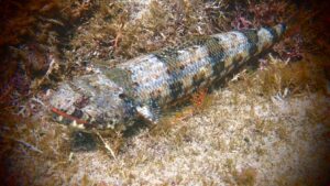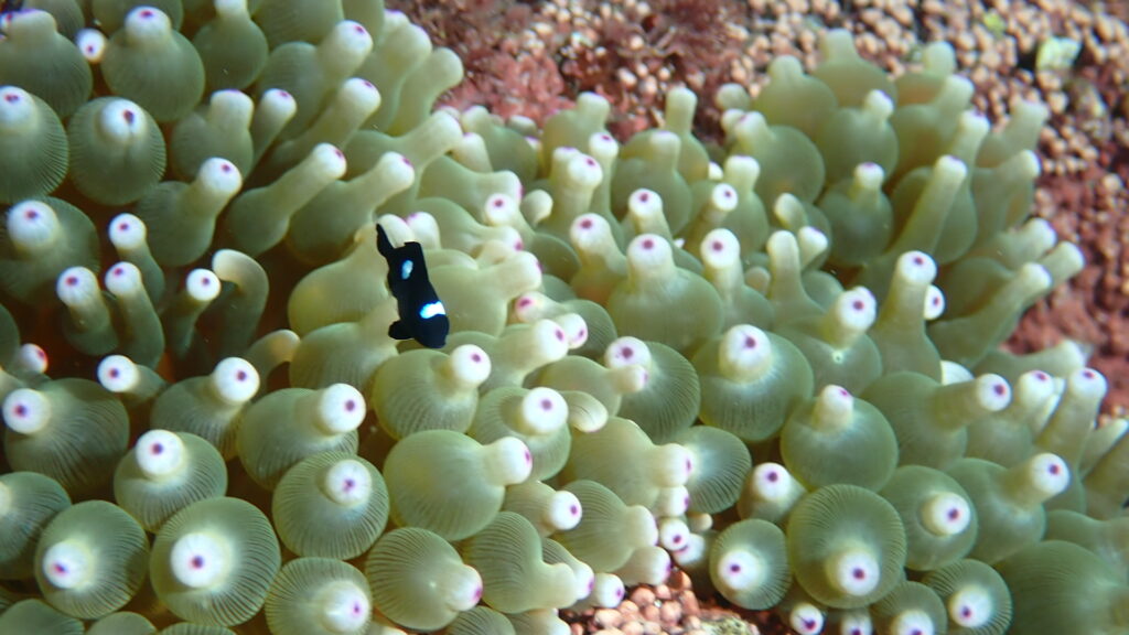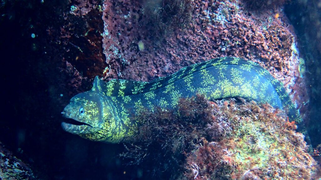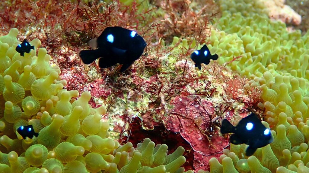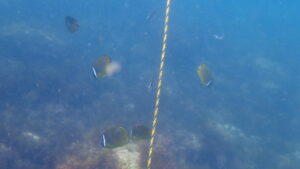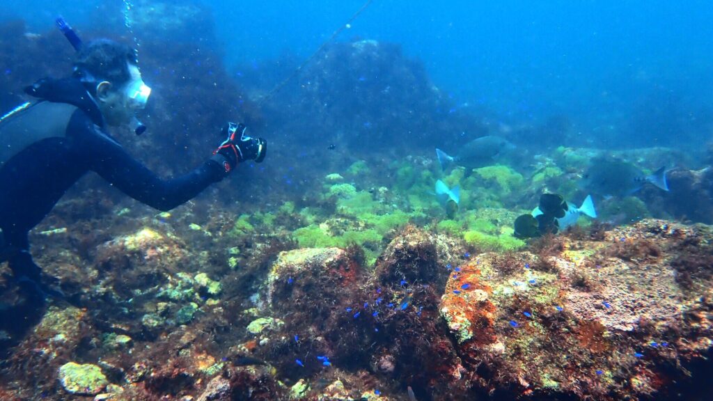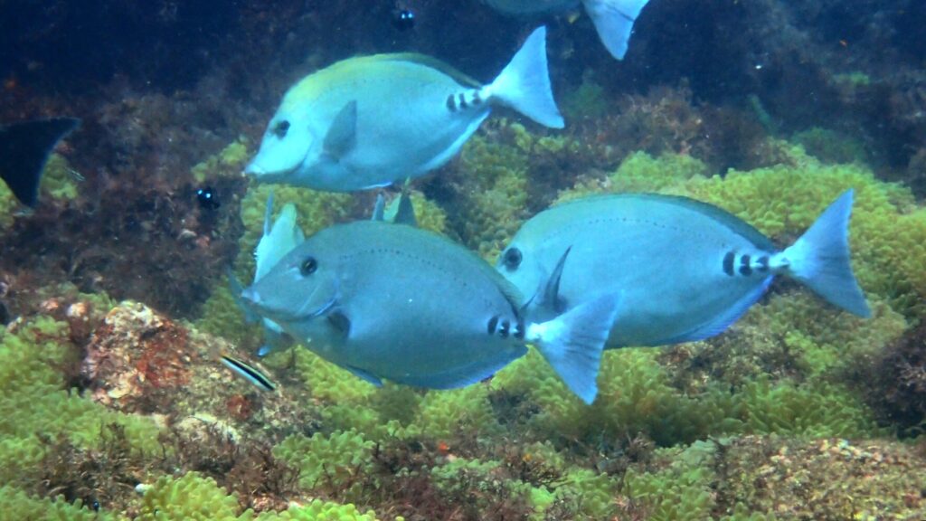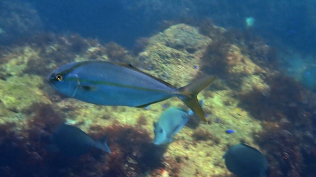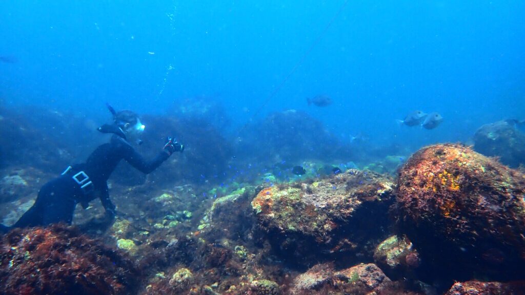 魚が非常に多く、ネンブツダイやクロホシイシモチ、ソラスズメダイのような小魚からメジナ、ニザダイ、ブダイなどの中型の魚、カンパチやイシダイなど釣りのターゲットまで見ることができる。