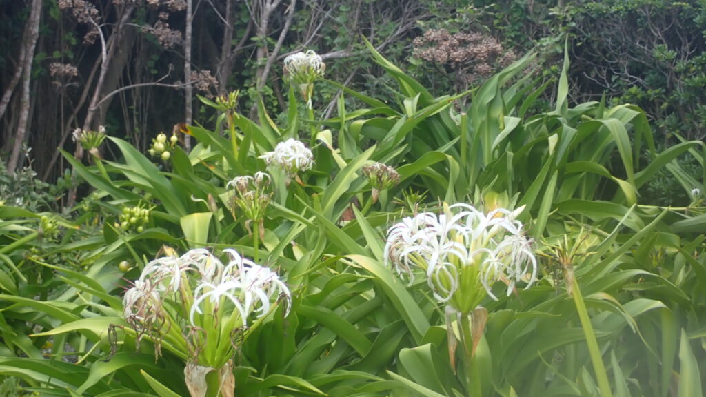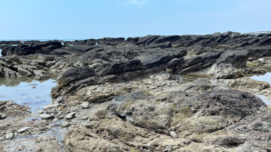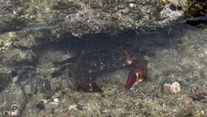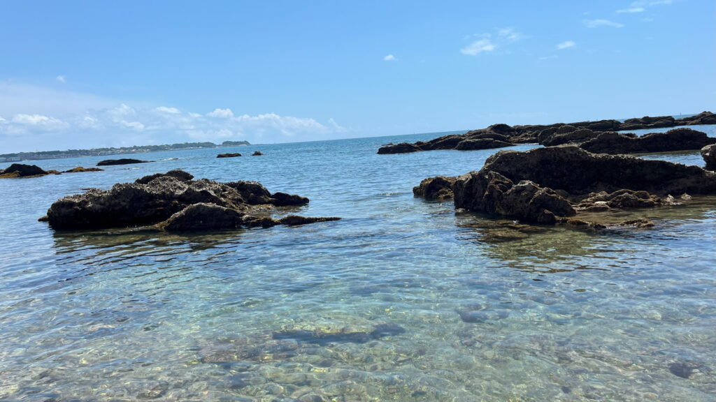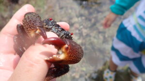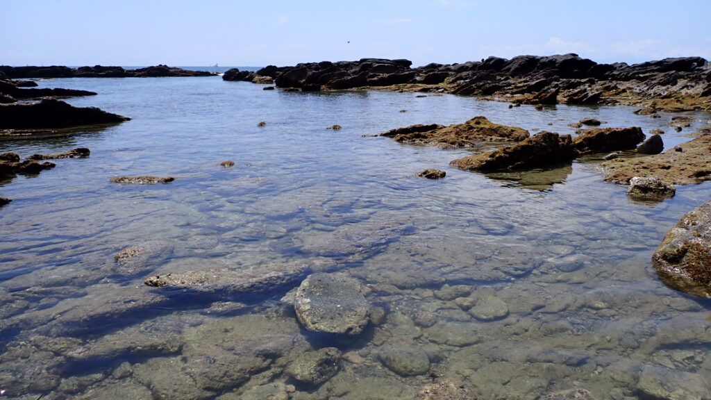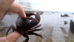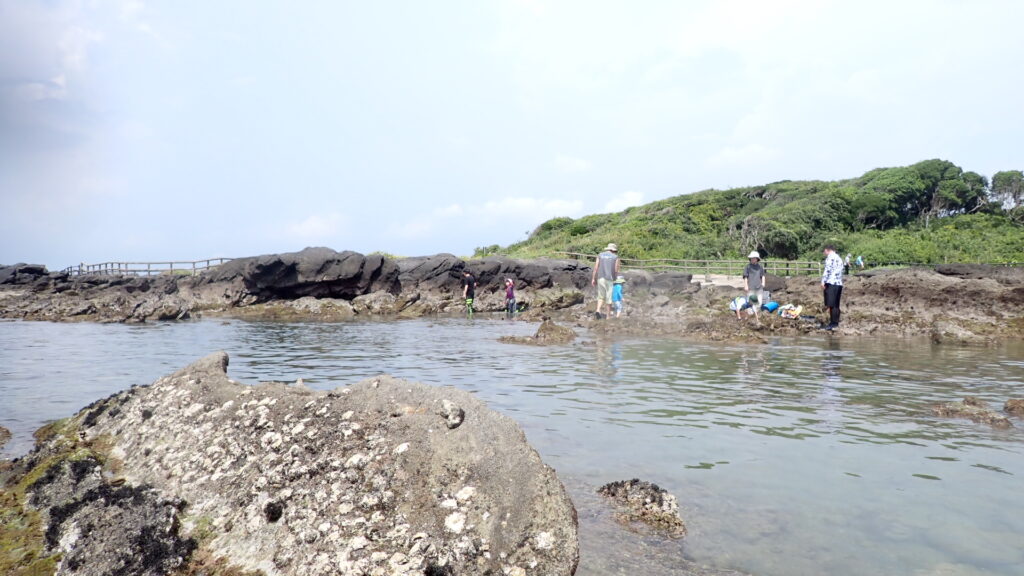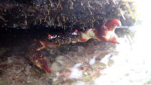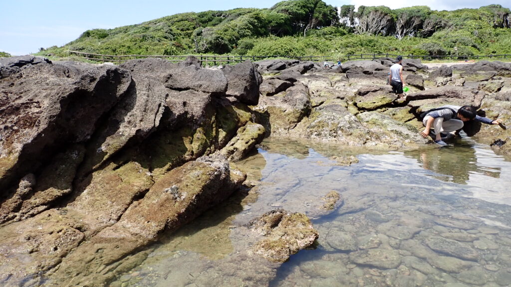 シュノーケリング禁止のためカニやヒトデなどを観察するのがメインとなる。イボのある分厚いハサミを持つのはイボイワオウギガニ。岩をひっくり返すとクモヒトデがたくさん見つかる。レアな生き物としてはシロウミウシを見つけたことがある。