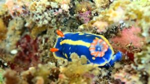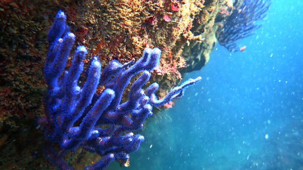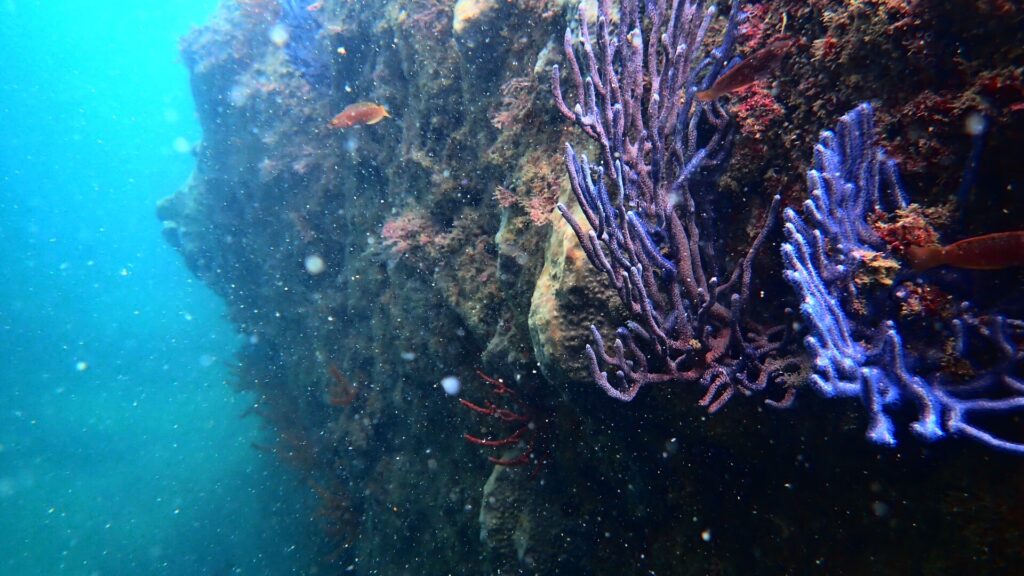 水深3~5mのやや深い場所や岩陰を探るとウツボやカサゴなどを見つけることができる。数は少ないがサンゴも見られ、透明度も5~10mと関東では良い方。イソギンチャクや海藻類も豊富で、天然記念物に指定されているだけあって三浦半島ではもっとも多様性を感じられるスポットのひとつ。