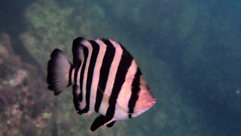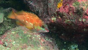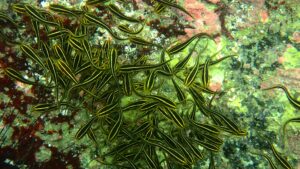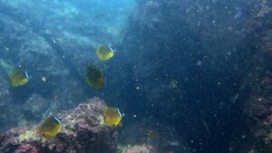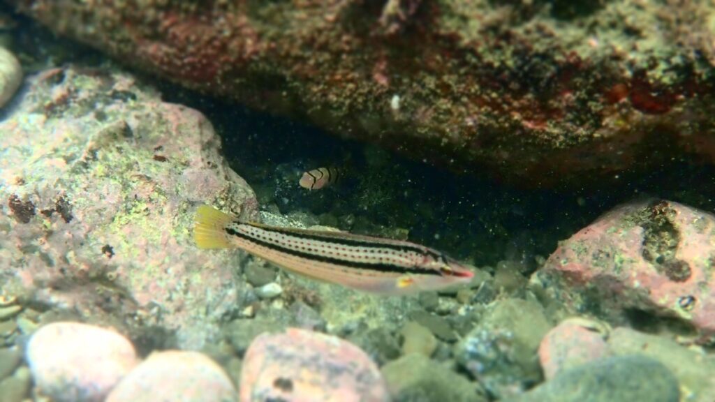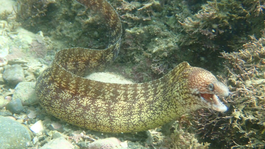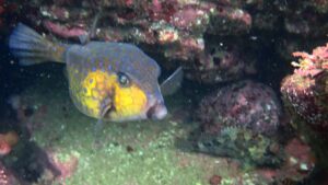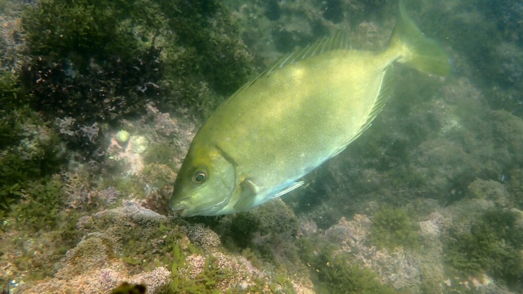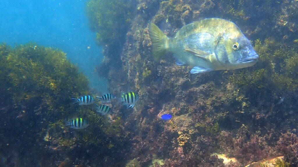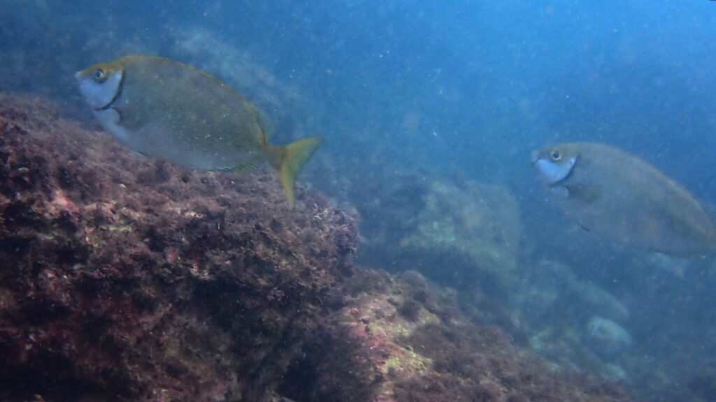 他に見応えのある魚はメジナやアイゴ、ニザダイ、ハコフグなど。イシガキダイやイシダイの幼魚、アカハタも稀に見かける。