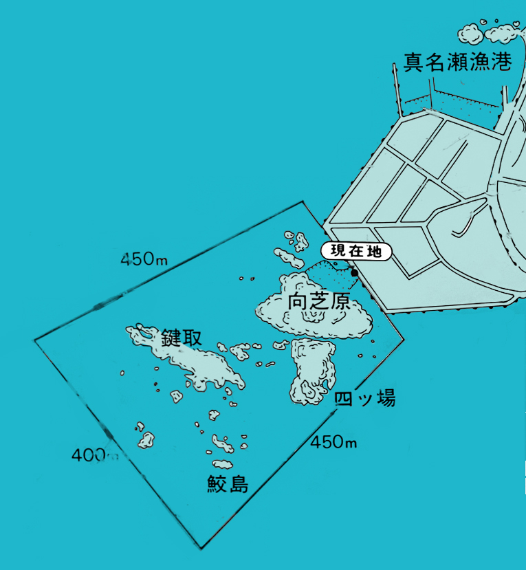 四角で囲まれたエリアが保護区。「現在地」の箇所に入口の階段がある。向芝原、鎌取、四ツ場の内側は水深0.5~2m程度の遠浅の磯。外側は水深3m以上になり、波も高くなる。